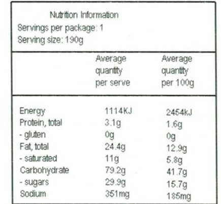 Ingredients: Dairy Free Margerine (animal fat, emulsifier (471,322-SOY), Acidity Regulator(500), antioxidant (307b-SOY), color 160a, food acid 330), castor Sugar, Rice Flour, Tapioca Flour, EGGS, Vanilla, Stabiliser(412), Apple diced, Blueberries, colset.
